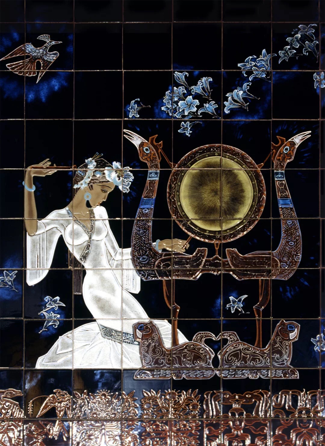 人们常将壁画创作项目称之为“工程”,其制作至关重要。现代壁画多采用材料制作,选择哪种材料来完成一件壁画作品,主要基于对主题与环境适合性的考虑。我们对各类材料均有所尝试,比如第一件壁画《楚乐》采用的是高温釉陶版,后来的作品又做过瓷砖釉上彩、丙烯沥粉彩绘、大漆、金属铸造与锻造、马赛克镶嵌、大理石镶嵌、石刻、纤维织造等,可以说金、木、水、火、土样样涉猎了一番。
